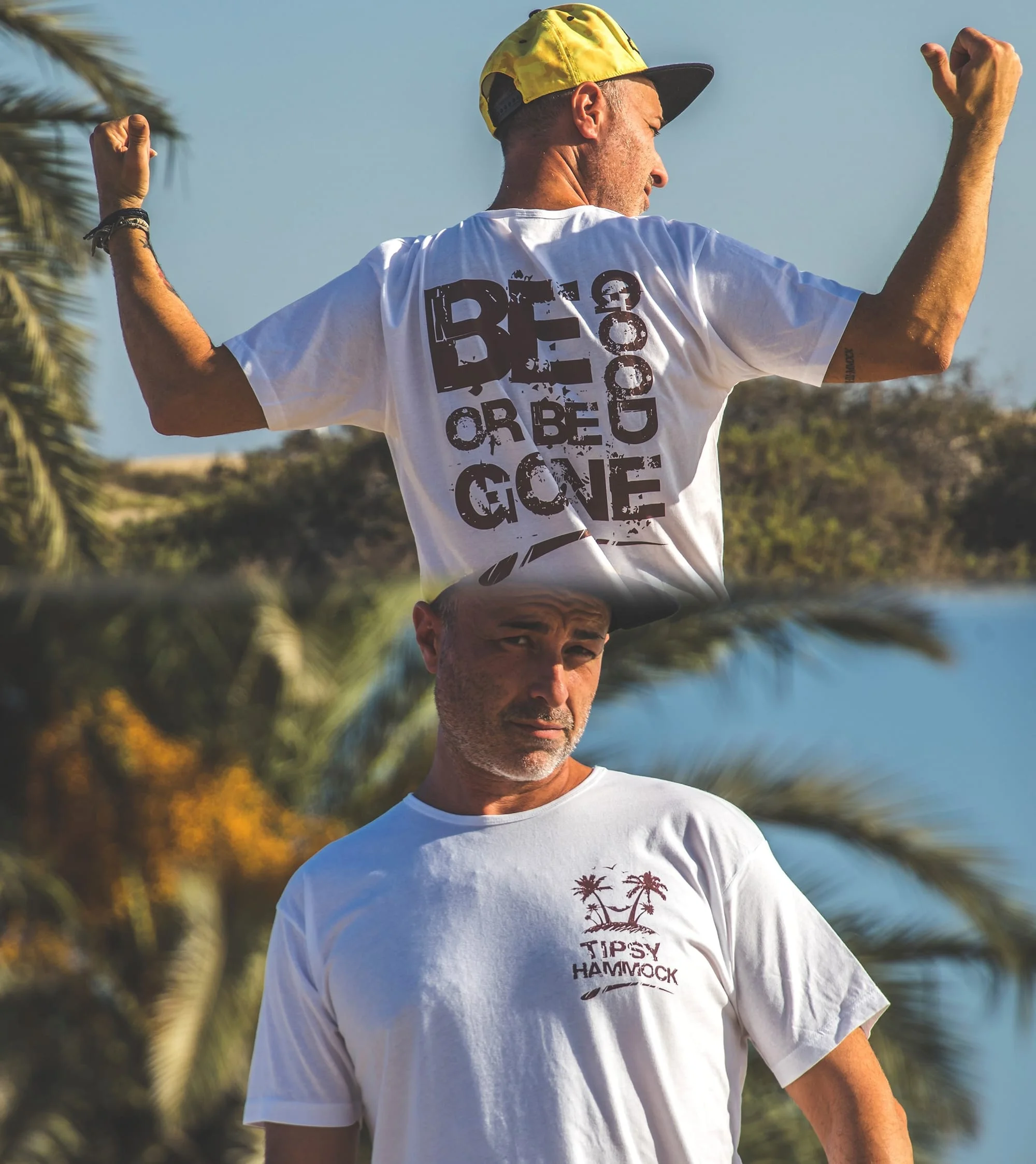 Short sleeves white T-Shirt with Tipsy Hammock Logo and the phrase “BE GOOD OR BE GONE” in brown. Material:Cotton